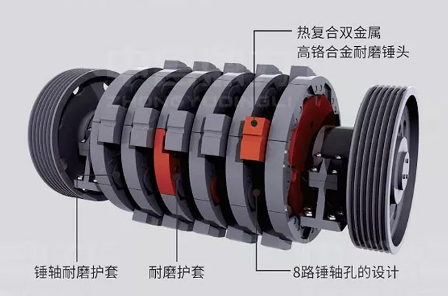 當(dāng)物料進(jìn)入破碎腔后,電機(jī)帶動轉(zhuǎn)子旋轉(zhuǎn),轉(zhuǎn)子帶動錘頭將物料打到反擊板上進(jìn)行破碎,過后在進(jìn)行反拋進(jìn)行再次破碎,重復(fù)以上過程,物料會由大到小,等破碎到合適粒度,就會從排料口出來,而且出料粒度可以根據(jù)自己的要求調(diào)整大小。