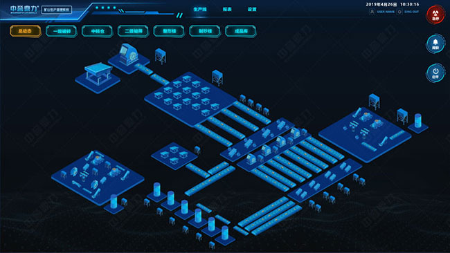 3、砂石骨料生產(chǎn)設(shè)備自動化控制系統(tǒng)即礦山生產(chǎn)管理系統(tǒng),提供人機(jī)交互界面,可對粉碎設(shè)備各組合體系做出啟停、聯(lián)動參數(shù)以及守護(hù)、報警參數(shù)的設(shè)置,提供設(shè)備故障報警實(shí)時查詢。