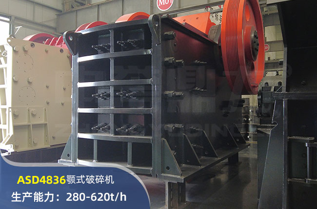 ASD4836顎式破碎機進料口尺寸1220×910mm,進料粒度≤850mm,出料大小≤75mm,電機功率160kw,時產(chǎn)在280-620噸左右。