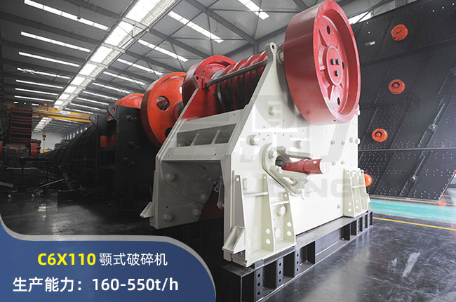 C6X110顎式破碎機進料口尺寸850×1100mm,進料粒度≤850mm,出料大小≤80mm,電機功率160kw,時產(chǎn)550噸。