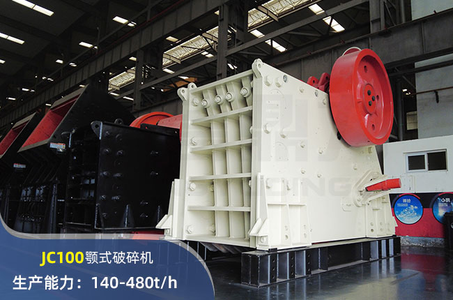 JC100顎式破碎機(jī)進(jìn)料口尺寸1000×760mm,進(jìn)料粒度≤640mm,出料大小≤70mm,電機(jī)功率110kw,時(shí)產(chǎn)量480噸左右。