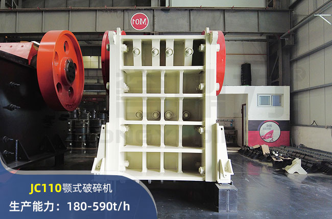 JC110顎式破碎機(jī)進(jìn)料口尺寸1100×860mm,進(jìn)料粒度≤720mm,出料大小≤70mm,電機(jī)功率110kw,時(shí)產(chǎn)量在590噸左右。