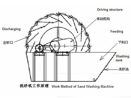 輪斗式洗砂機主要結構包括洗砂池、輪斗、電機、下料口等組成,輪斗洗砂機工作的時候電機通過三角帶、減速機、齒輪減速后帶動葉輪緩慢轉動,砂石由給料槽進入洗砂池中,在葉輪的帶動下翻滾,并互相研磨,除去覆蓋砂石表面的雜質,同時破壞包覆砂粒的水汽層,以利于脫水。同時加水,形成較強大的水流,及時將雜質及比重小的異物帶走,并從出砂口排出,從而完成清洗作用。干凈的砂石由葉片帶走, 后砂石從旋轉的葉輪倒入出料槽,完成砂石的清洗作用。