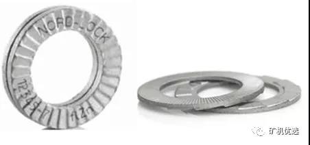 該防松墊圈由兩片墊片組成,外側(cè)是帶有放射狀凸紋面,內(nèi)側(cè)為斜齒面。當裝配時,內(nèi)側(cè)斜齒面間相對,外側(cè)放射狀凸紋面與兩端接觸面成咬合狀態(tài)。當連接件受到振動,并使螺栓發(fā)送松動趨勢時,僅僅允許兩片墊圈內(nèi)側(cè)斜齒面間相對錯動,產(chǎn)生抬升張力,從而達到100%的鎖緊效果。