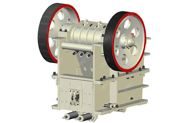 復擺顎式破碎機的動鄂直接懸掛在偏心軸上,動鄂底部由推力板一端支撐,推力板另一端支撐在于機架后壁相連的楔形調(diào)整機構的楔鐵,在偏心軸兩端裝有飛輪和帶輪(此時起飛輪影響);飛輪輪緣上的配重用以部分地均衡連桿在運動時所出現(xiàn)的慣性力,碎石機的出料口設計是可調(diào)的,調(diào)整楔鐵上的螺絲可取得所所需的出料口尺寸。