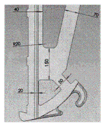 原始的機(jī)構(gòu)尺寸如下圖1,分別對額板處、額板背面,肘板銜接處、出料口出的尺寸進(jìn)行優(yōu)化,為肘板的安系數(shù),肘板銜接處的尺寸限尺寸定為:Xmin=50毫米,其它幾個(gè)尺寸分別根據(jù)邊界條件進(jìn)行優(yōu)化,通過6次迭代,取得優(yōu)化后的結(jié)構(gòu)尺寸如下圖2。