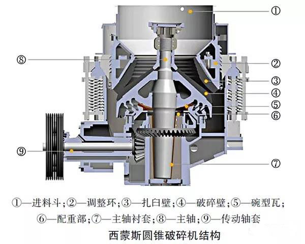 關(guān)鍵有機(jī)架、水準(zhǔn)軸、動(dòng)錐體、均衡輪、偏心套、上粉碎壁(不變錐)、下粉碎壁(動(dòng)錐)、液力偶合器、潤(rùn)滑體系、液壓體系。
