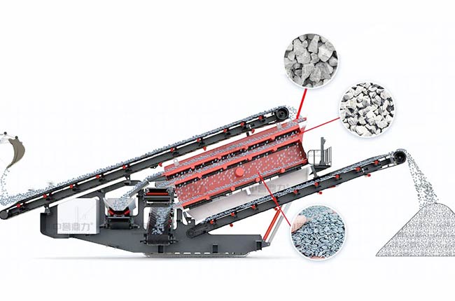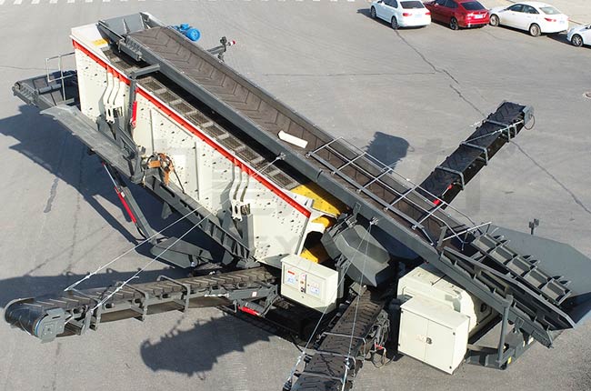 輪胎移動(dòng)篩分機(jī)工作時(shí),上料皮帶機(jī)將原料送至篩分機(jī)頂部,通過振動(dòng)篩篩選作業(yè),頭層篩網(wǎng)大顆粒骨料會(huì)通過返料皮帶機(jī)返回上級(jí)破碎機(jī),其他層級(jí)篩網(wǎng)篩出的物料從篩機(jī)兩側(cè)可用移動(dòng)皮帶機(jī)輸送。