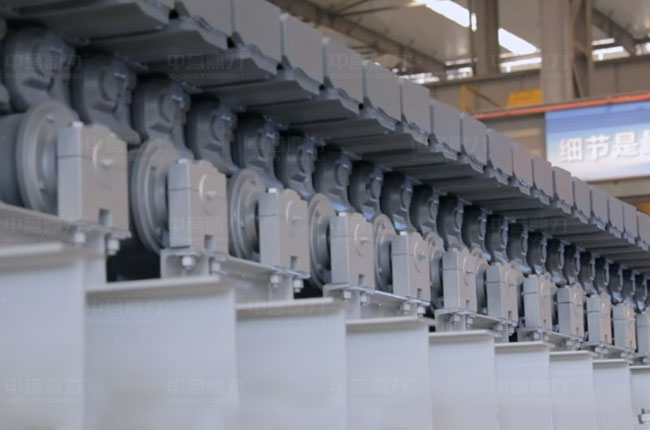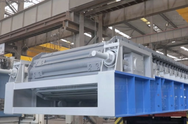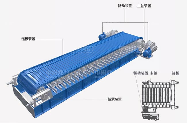 板式給料機的組成部分包括機架、主軸裝置、驅動裝置(電動機、聯(lián)軸器、減速器)、鏈板裝置、拉緊裝置、支重輪、托鏈輪等。