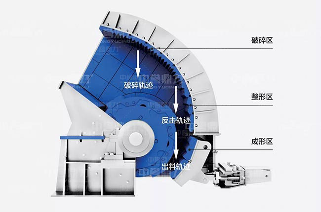 破碎區(qū)、整形區(qū)、成型區(qū)三個(gè)工作區(qū),物料會(huì)經(jīng)過(guò)破碎、反擊破碎及整形破碎三個(gè)流程