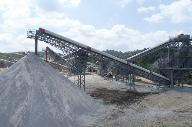 大塊石灰石經(jīng)料倉(cāng)通過(guò)給料機(jī)除雜質(zhì),泥土后,由PCZ1815重錘破進(jìn)行粗破,破碎后的石料經(jīng)3070振動(dòng)篩進(jìn)行篩選,未達(dá)到要求的石料返回1622整形破碎機(jī)進(jìn)行破碎,符合制砂要求的由1218雙轉(zhuǎn)子制砂機(jī)進(jìn)行細(xì)碎制砂。