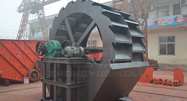 工作時,在電機的帶動下三角帶、減速機、齒輪減速后帶動葉輪進行轉(zhuǎn)動,石粉物料由給料槽進入洗槽中,在葉輪帶動下翻滾,等除去石粉表面雜質(zhì)后完成清洗,從溢出口洗槽排出。干凈的石粉由葉片帶走,然后砂石從旋轉(zhuǎn)的葉輪倒入出料槽。