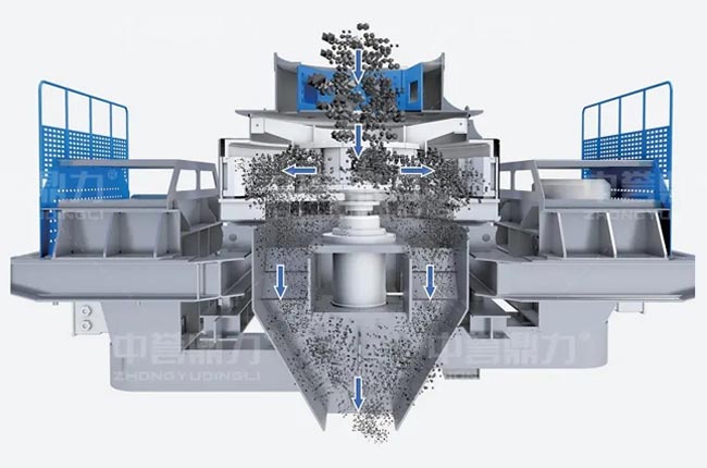 中譽(yù)鼎力VSI沖擊式制砂機(jī)是利用高速運(yùn)動(dòng)的物料相互碰撞、摩擦自行破碎,在破碎的同時(shí)進(jìn)行了石料的整形處理