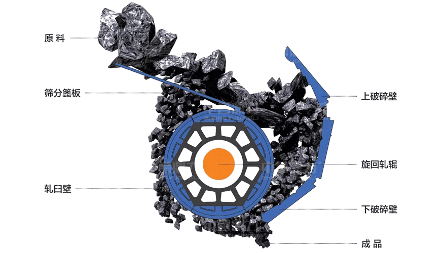 通過以下原理圖,可以看出,原料從進(jìn)料口進(jìn)入機(jī)破碎腔,會(huì)先通過篩分篦板進(jìn)行預(yù)分離處理,將小塊成品大小碎石分離出去,其它石頭會(huì)進(jìn)入破碎腔,通過軋臼壁及破碎壁的擠壓,實(shí)現(xiàn)對(duì)石頭的破碎處理。臥式旋回破工作時(shí)旋回破碎輥會(huì)產(chǎn)生反向自轉(zhuǎn),使軋臼壁磨損更加均勻,避免因局部磨損更換整個(gè)部件的現(xiàn)象。另外排料口采用液壓調(diào)整,可以智能調(diào)整排料口大小。
