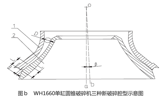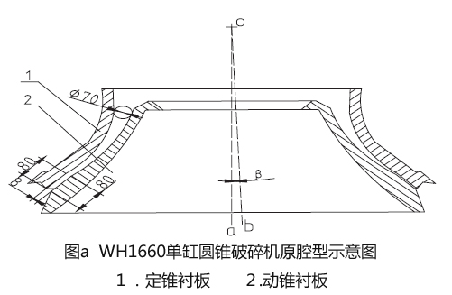 圓錐碎石機(jī)的腔型是決定設(shè)備細(xì)粒級含量的因素,我們決定對于WH1660單缸圓錐碎石機(jī)的粉碎型腔進(jìn)行再次設(shè)計(jì),以使該設(shè)備能符合f=12 的平均莫氏硬度巖石的生產(chǎn)要求。