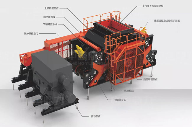 中細(xì)碎臥式旋回破結(jié)構(gòu)主要由上破碎壁總成、下破碎壁總成、防護(hù)罩、破碎腔、液壓調(diào)整及過載保護(hù)裝置、傳動(dòng)總成、機(jī)架總成等共同組成。
